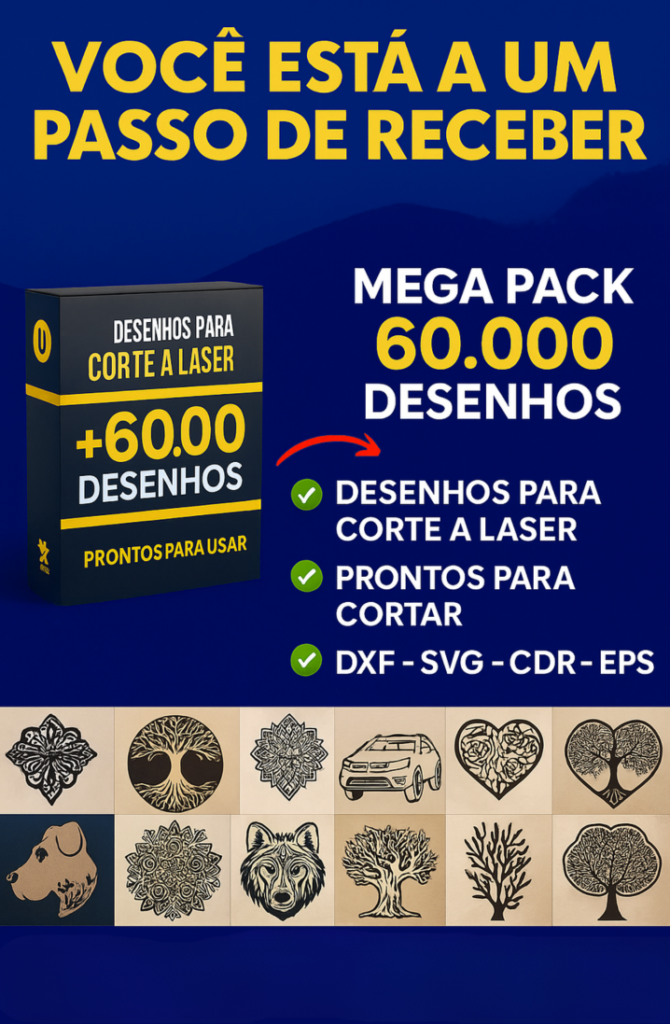 A Mega Coleção é abrangente, oferecendo 6 tipos de arquivo distintos: CDR, SVG, PNG, DXF, PDF e EPS. Essa variedade garante compatibilidade com uma gama de softwares e equipamentos de corte a laser.